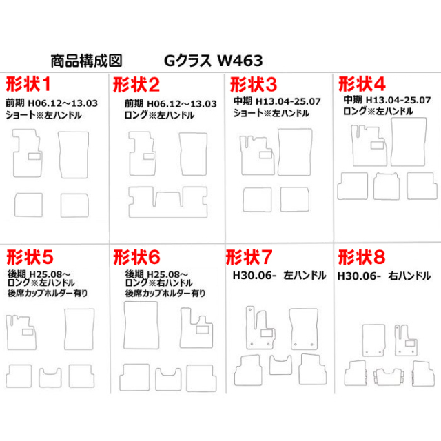 マットカラー:01:無地 × ブラック/形状選択:4:W463 中期 左ハンドル ロング 価格: 10,800円(税込) | 無し |